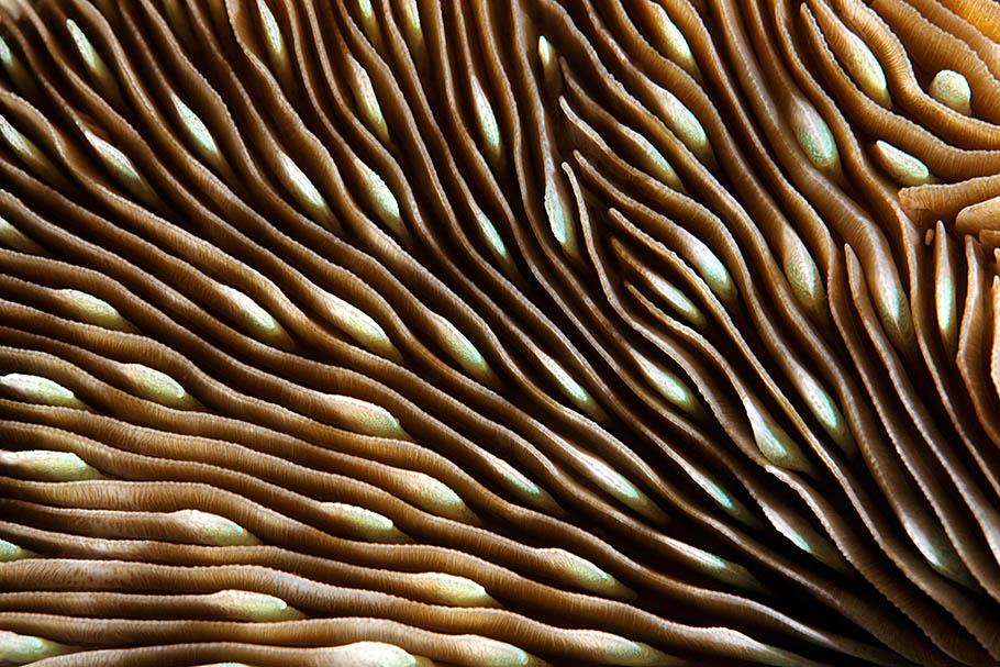 This solitary coral doesn’t form colonies and is composed of only one polyp of either a circular or elongated shape. Symbiotic algae reside within the coral that provide it with nutrients through photosynthesis. Their beautiful tentacles form concentric circles that transfer captured plankton to the mouth as a supplement to their diet. In this close up image we can see how its radial structure creates a dynamic composition that evokes the journey of sperm in search of a new life.