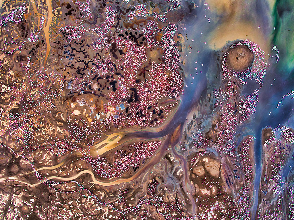 During the formation of the soda lakes in Kenya’s Great Rift Valley, much of the ground was covered in sodium carbonate rich, volcanic ash. Rain water percolating through the soil and rivers flowing over the rocks, absorbed and transported volcanic chemicals and mineral salts into the lakes. With reduced rainfall, the concentration of these salts is greater and typically produces more vivid colours. While the lakes are inhospitable to most life forms, flamingos thrive in them. The reason being that one plant species has adapted to cope with the challenging conditions, algae and in particular one species, Spirulina, commonly known as blue-green algae, the flamingos' principal food source. Flying around the edge of the lake, I passed over a giant pink cloud of Lesser Flamingos grouped tightly together in the mud and algae infused shallow waters of Lake Bogoria forming a veritable “Rainbow City”.