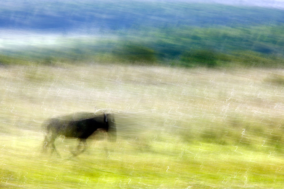 Known in Swahili as nyumbu, this species of antelope is one of the principal protagonists of the mass African migrations. From June to the ends of October some two million gnus or wildebeest, Connochaetes taurinus, head to the Serengueti in Tanzania. Once the dangerous muddy waters of the River Mara have been negotiated, the “Great Herd” finds the coveted fresh pastures. This lone straggler gave me the opportunity to use the panning technique to create an image similar in style to that of the great impressionist painter Claude Monet.