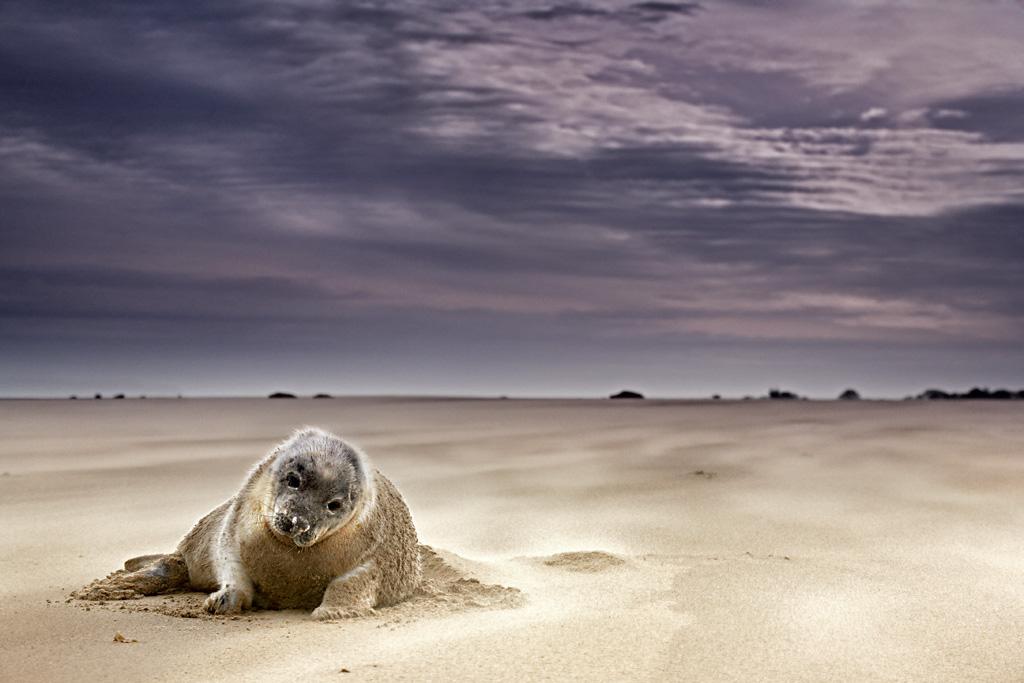 The Grey Seal is one of the most charismatic of British mammals. Many cubs are born each year at breeding grounds on the coast of Lincolnshire. The female only gives birth to one cub which is suckled during the first 3 weeks of life. After 15 days they loose their soft white fur and are abandoned by their mothers, who mate again and return to the sea. All alone on the beach the cubs are forced by hunger to fend for themselves and find their own food.