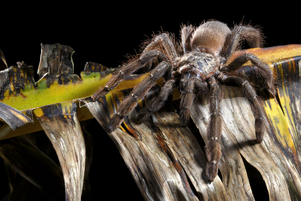 This tree dwelling tarantula can be found living amongst cracks in the bark, hollow branches or leaves of the trees of its native Central America, where it is locally known as the horse biter or pica caballo. They are much more active at night when they descend to the ground to hunt and can come into accidental contact with grazing horses. Acting in self-defence the spider injects poison into the leg or foot, which while not fatal can cause serious tissue damage producing burns similar to those caused by caustic acid. This spider usually feeds on small birds and rodents once tissues begin to dissolve after the fatal bite.