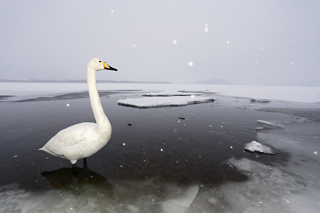 Lake Kussharo is a caldera lake and it is located in Akan National Park. The eastern Russian populations of whooper swans, Cygnus cygnus, migrate southeast hundreds of miles to their wintering sites in eastern Asia. They gather at major bays and coastal lagoons like those of Lake Kussharo which are kept ice frozen by the heat of a geothermal activity along the shore, where in the calm, freezing winter air temperatures can drop at dawn below -25ºC. With a great deal of patient, I was able to get close enough and photograph this specimen with my wide-angle lens surrounded by a breathtaking frozen landscape. A subtle gleam from the camera´s flash added to the natural lighting, helped me enhance these beautiful snowflakes and create this magical scene of a bird which is considered a symbol of love and fidelity.
