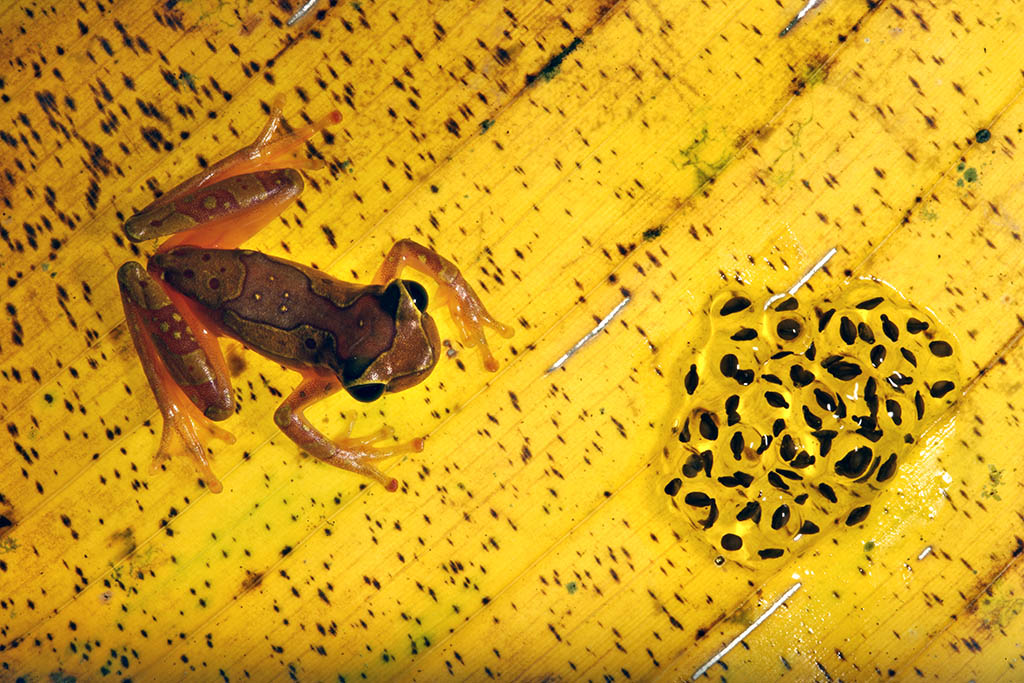 Principally active at night and after rainfall, this frog displays a golden brown colour with tiny yellow spots. Individuals can change colour depending on the time of day or their levels of stress. Their principal identifying feature is the hourglass outline on their backs. Their eggs are laid on an over-hanging leaf, so that the tadpoles can develop safe from predators until they hatch and drop directly into the water.
